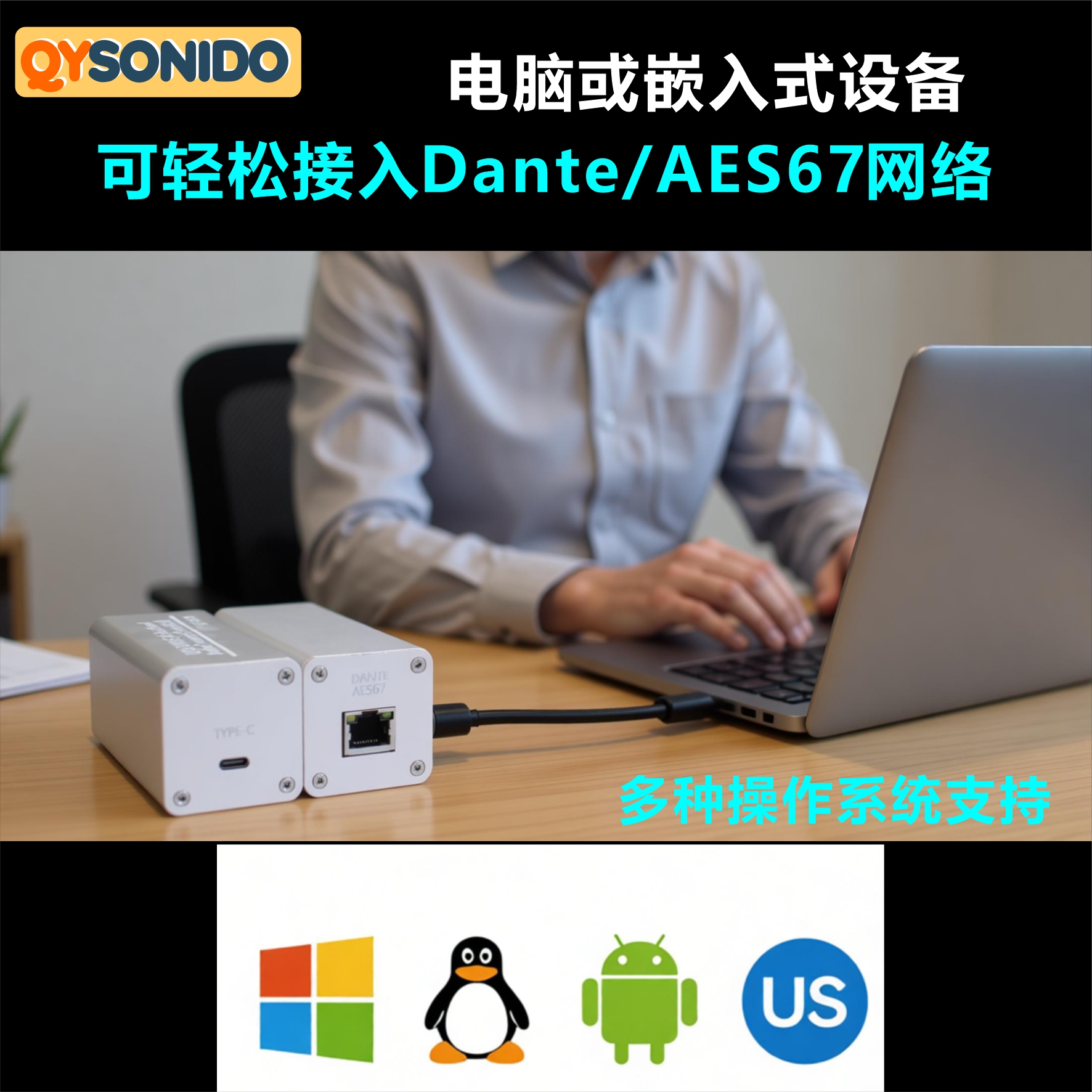 这款便携式USB声卡,专为解决现代电脑(尤其是超薄本)缺乏有线网口而生。只需插入USB口,无需安装任何驱动,即可让您的Windows、Mac或Linux电脑立即融入专业的Dante/AES67音频网络。