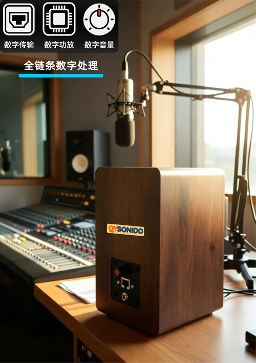 全链路数字处理,从网络传输,到数字功放芯片,再到数字音量调节,高保真输出